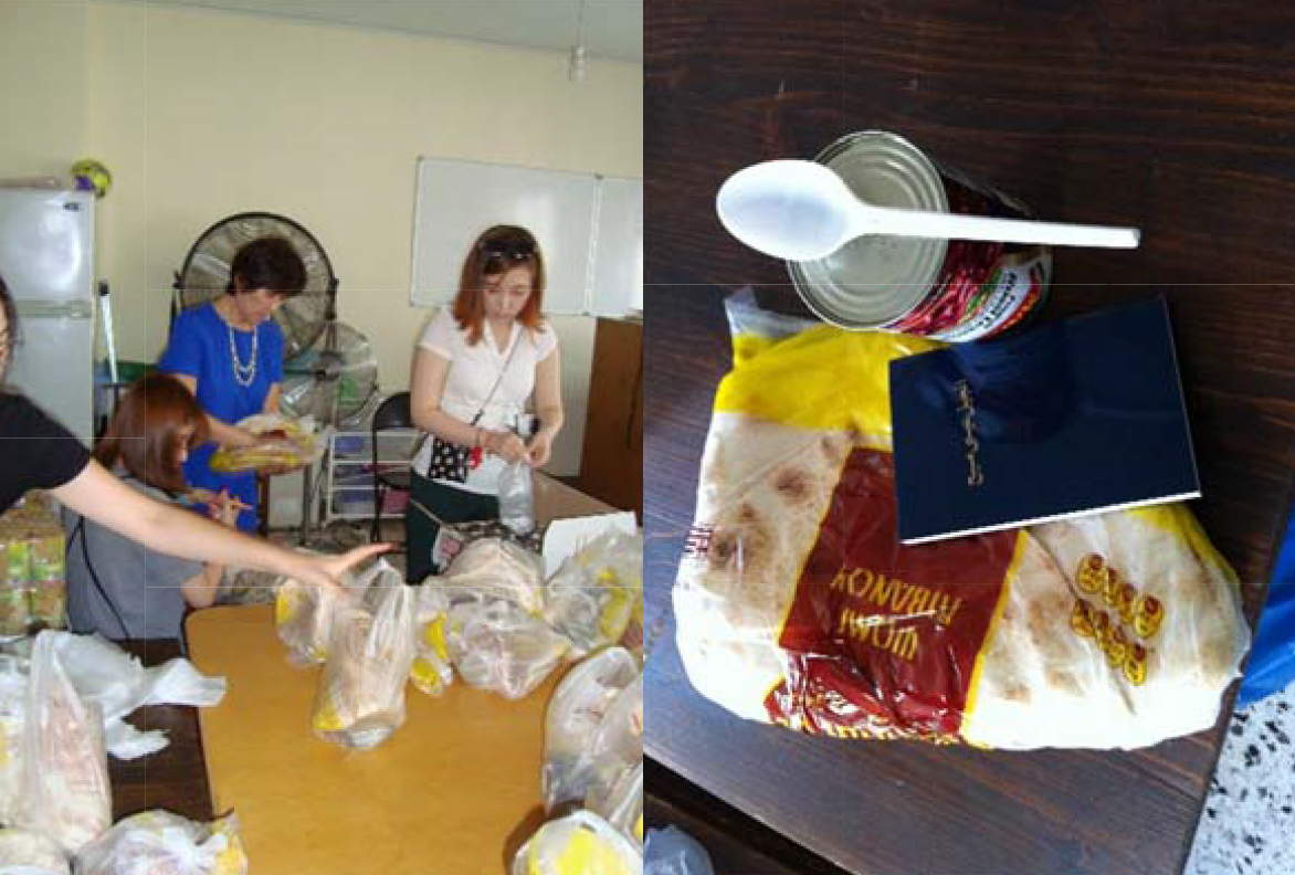 저희가 준비하는 음식물은 1봉지에 콩 통조림 1개 에 (80 센트)+아랍 빵 (50센트) 혹은 도시락(닭다리 반쪽+밥+살라드+빵)은 약 1유로 50-80센트 비용이 들어갑니다.