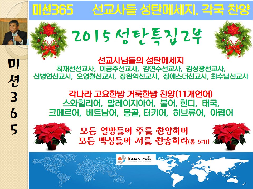 Home 선교방송 미션 365 선교방송미션 365 2015 선교사 성탄인사와 각국언어 고요한밤 거룩한밤 성탄특집 2부 By Son4u - Dec 16, 2015 1620 0 SHARE Facebook Twitter