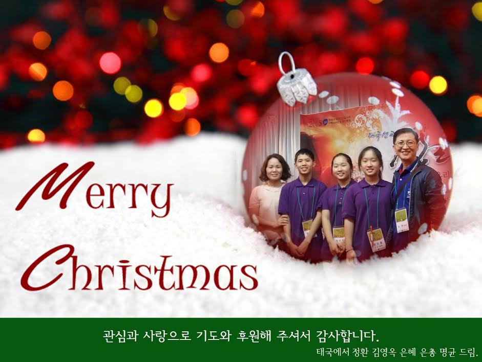 Home 선교정보자료 선교사편지 선교정보자료선교사편지 Merry Christmas & Happy New Year By Son4u - Dec 30, 2015 295 0 SHARE Facebook Twitter Merry Christmas & Happy New Year. 복되고 기쁜 성탄과 희망찬 새해를 맞이하시기를 두손모아 기도드립니다. 정환 선교사 드림.