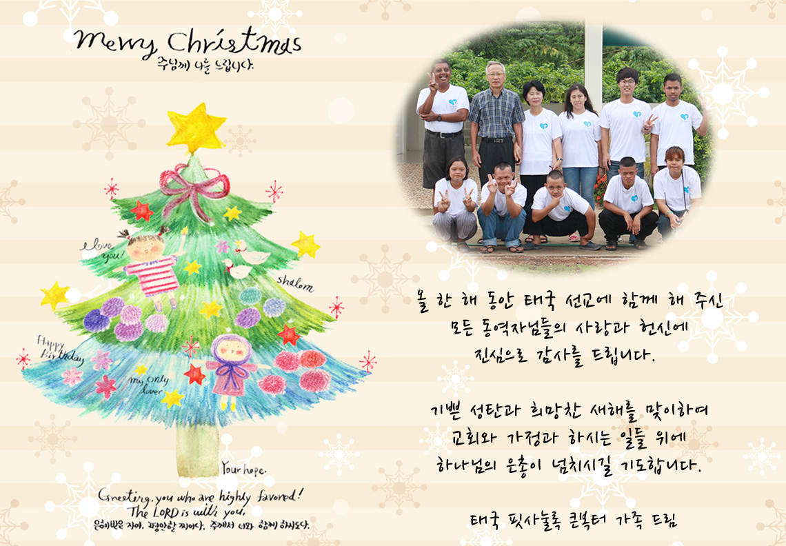 Home 선교정보자료 선교사편지 선교정보자료선교사편지 송태규, 홍애숙 선교사 성탄 카드 By Son4u - Jan 4, 2016 2130 0 SHARE Facebook Twitter 샬롬!!! 동역자님들께 성탄인사를 첨부하여 드립니다. 기쁜 성탄을 맞이하여 우리 가운데 성육신하신 주의 긍휼하심이 충만하시길 기도합니다. 사랑의 빚진 자 송태규, 홍애숙 선교사 드림