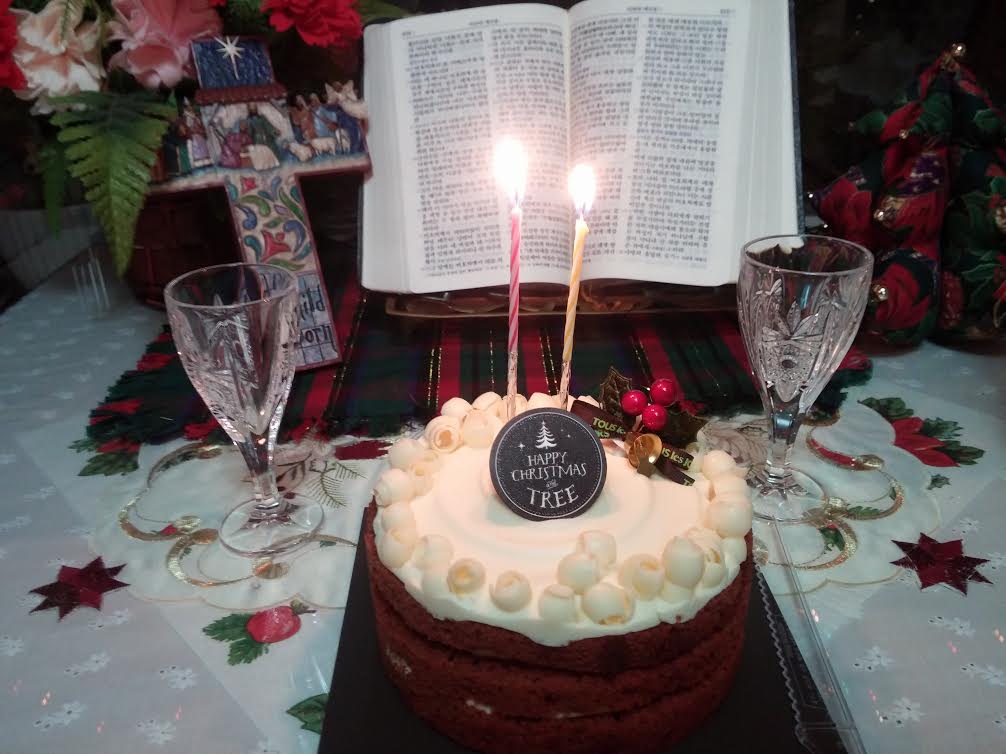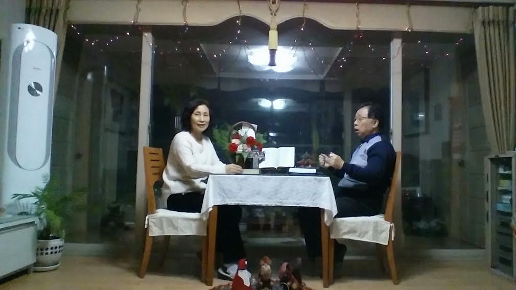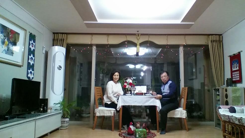 (20015.12.25. 10am)-노종해 최완숙 선교사 부부는 갈릴리CMRC에서 성탄이브 기도회와 축하의 밤을 가졌다.(6:30-9pm) 창가 작은 테이블 위에는 예배센타로 성경, 십자가(크리스마스 예수탄생), 화환과 작은 성탄츄리를 세워 놓고 선교사 부부는 마주 앉았다.