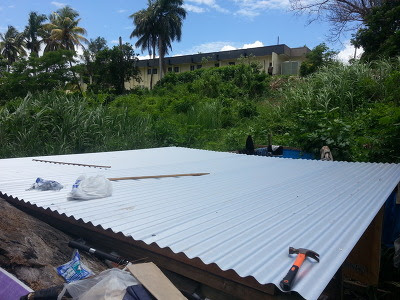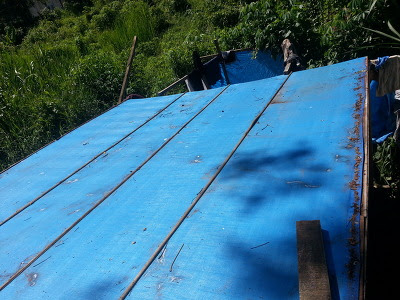 그렇게 몇 번을 반복해서 양철지붕을 덮고서 못질은 더 이상 할 수가 없어서 쉬었다가 오후 4시가 넘어서 지붕에 다시 올라가 못을 박고 양철지붕을 완성했다.