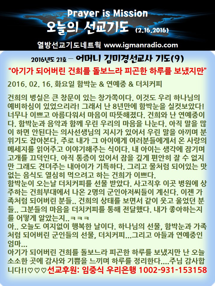 Home 선교정보 국가를 위한 기도 선교정보국가를 위한 기도 2016년도 21호 – 건희군 어머니 김미경선교사 기도(9) By Son4u - Feb 16, 2016 1522 0 SHARE Facebook Twitter