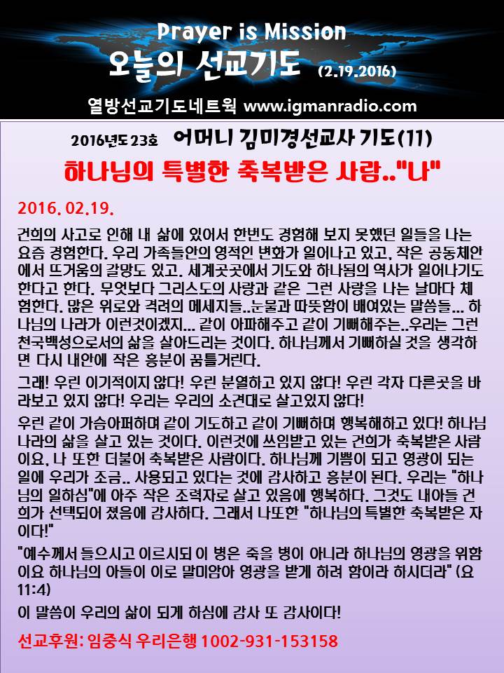 Home 선교정보 국가를 위한 기도 선교정보국가를 위한 기도 2016년도 23호 – 건희군 어머니 김미경선교사 기도(11) By Son4u - Feb 19, 2016 1117 0 SHARE Facebook Twitter
