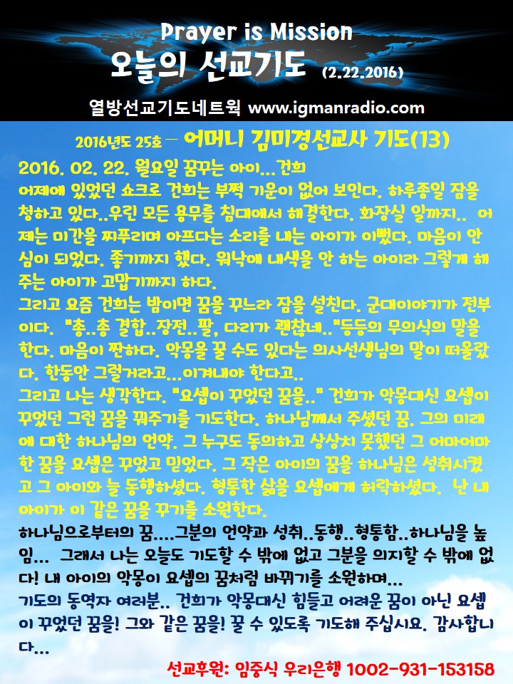 Home 선교정보 국가를 위한 기도 선교정보국가를 위한 기도 2016년도 25호 – 건희군 어머니 김미경선교사 기도 2월 22일 (13) By Son4u - Feb 24, 2016 610 0 SHARE Facebook Twitter