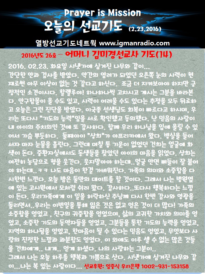 Home 선교정보 국가를 위한 기도 선교정보국가를 위한 기도 2016년도 26호 – 건희군 어머니 김미경선교사 기도 2월 23일 (14) By Son4u - Feb 24, 2016 1477 0 SHARE Facebook Twitter
