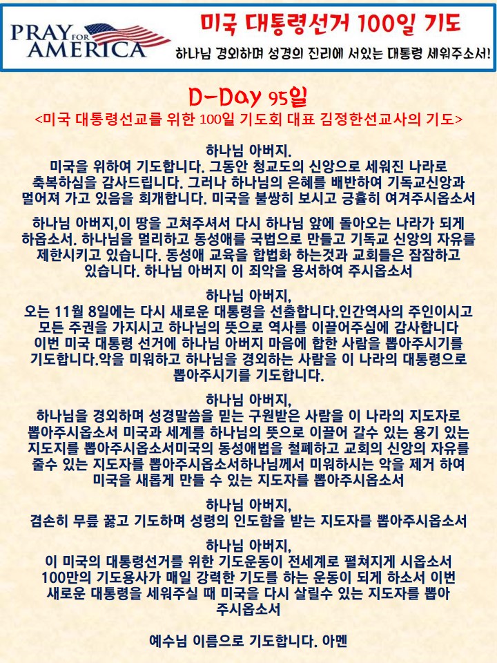 Home 선교정보자료 미국대선 100일 기도운동 선교정보자료미국대선 100일 기도운동 D-Day 95 미국대통령선거를 위한 기도 By Son4u - Aug 4, 2016 2384 0 SHARE Facebook Twitter
