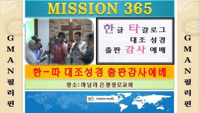Home 선교박람회 선교지 사역기회 영상소개 선교박람회선교지 사역기회 영상소개 GMAN Philippines 미션365_한글_따갈로그어 대조성경 출판 감사예배 By Son4u - Mar 14, 2017 1871 0 SHARE Facebook Twitter 한인선교사들의 필리핀 선교 40년의 한 획을 긋는 위대한 일을 하나님께서 행하셨습니다. 그것은 한글과 필리핀 공용어인 따갈로그어를 대조한 한_따 대조 성경이 출판되게 된 것입니다. 모든 영광을 하나님께 올려 드립니다.