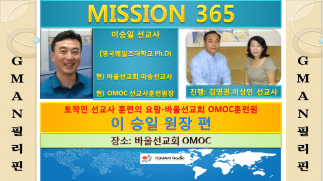 Home GMAN 해외방송 GMAN 필리핀 GMAN 해외방송GMAN 필리핀 GMAN PHILIPPINES_미션365_이승일 선교사 편 By Son4u - Sep 4, 2017 1369 0 SHARE Facebook Twitter 토착민 선교사 훈련의 요람 바울선교회 OMOC 훈련원장인 이승일 선교사를 통해서 선교사훈련원 사역에 대해서 들어본다.