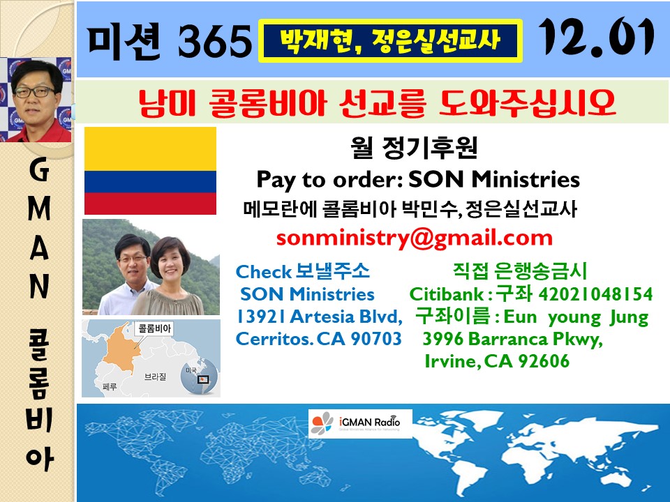 Home 선교방송 미션 365 선교방송미션 365 콜롬비아에 복음을… 박재현, 정은실선교사 By Son4u - Dec 2, 2017 1714 0 SHARE Facebook Twitter https://youtube.com/watch?v=HHMyIj4IgQI