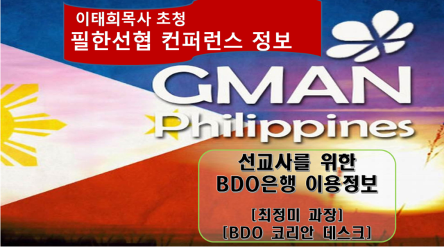 Home GMAN 해외방송 GMAN 필리핀 GMAN 해외방송GMAN 필리핀 11.필한선협컨퍼런스__선교사를 위한 BDO 은행 이용정보_최정미과장 By Son4u - Aug 1, 2018 494 0 SHARE Facebook Twitter 필한선협 선교사 영적 대각성 컨퍼런스 강사: 이태희 목사 외 일시: 2018.04.24(화)~26(목) 장소: 마닐라 제자교회(전대구목사) 주관: (사)민족복음화 운동본부 주최: 필리핀 한국선교협의회