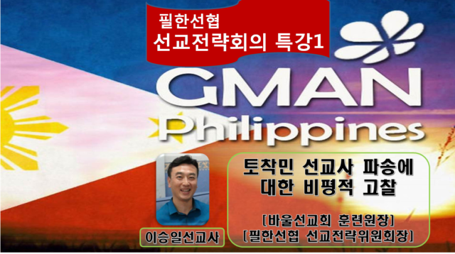 Home GMAN 해외방송 GMAN 필리핀 GMAN 해외방송GMAN 필리핀 선교전략회의_특강1_토착민 선교사 파송에 대한 비평적 고찰_이승일 선교사 By Son4u - Aug 28, 2018 1080 0 SHARE Facebook Twitter ■선교전략회의 •일시: 2017.08.24 •장소: 주빛교회(임장순) •주관: 필한선협 •주최: 필한선협