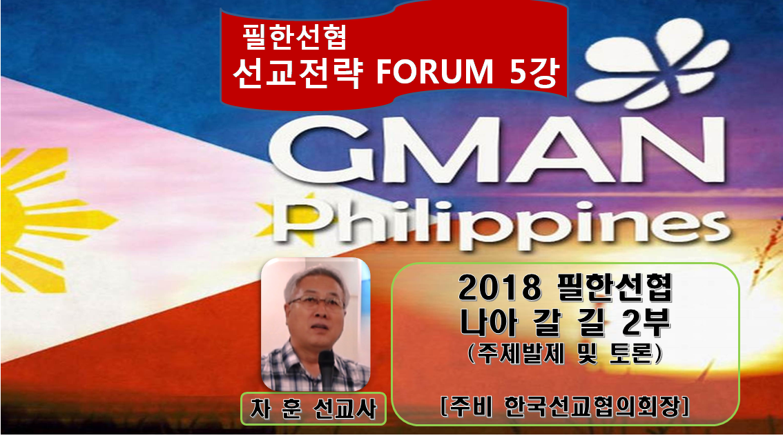 Home GMAN 해외방송 GMAN 필리핀 GMAN 해외방송GMAN 필리핀 필리핀 선교전략포럼_5강_2018 필한선협의 나아갈 길 2부_주제발제 및 토론_차 훈선교사 외 By Son4u - Sep 7, 2018 515 0 SHARE Facebook Twitter 일시: 2017. 11. 09~10 장소: 마닐라 한인감리교회(김낙경목사) 주최.주관: 필리핀 한국 선교협의회 후원: 군자중앙교회(박명홍목사)