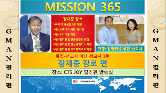 Home GMAN 해외방송 GMAN 필리핀 GMAN 해외방송GMAN 필리핀 GMAN 필리핀_미션365_특집_선교사 아닌 선교사1_장재중 장로편 By gm1 gm1 - Nov 25, 2018 4331 0 SHARE Facebook Twitter 35년이 넘는 필리핀 생활가운데 비즈니스맨으로서 선교사가 아니지만 한인교민과 현지인들 사이에서 여러 선한 사역을 통해서 선교의 지평을 넓히고 선교사회에 선한 이미지 역할을 하고 있는마카티 새생명교회 장재중 장로와의 인터뷰. 특별히 나병환자들을 위한 한센인 사역의 소록유니재단의 장립배경과 그리고 무슬림, 타종교권에 효과적이고 전략적인 장기적 복음전도와 선교의 해법을 제시한다. 일시: 2018.11.21(수) 장소: CTS JOY 필리핀 방송실