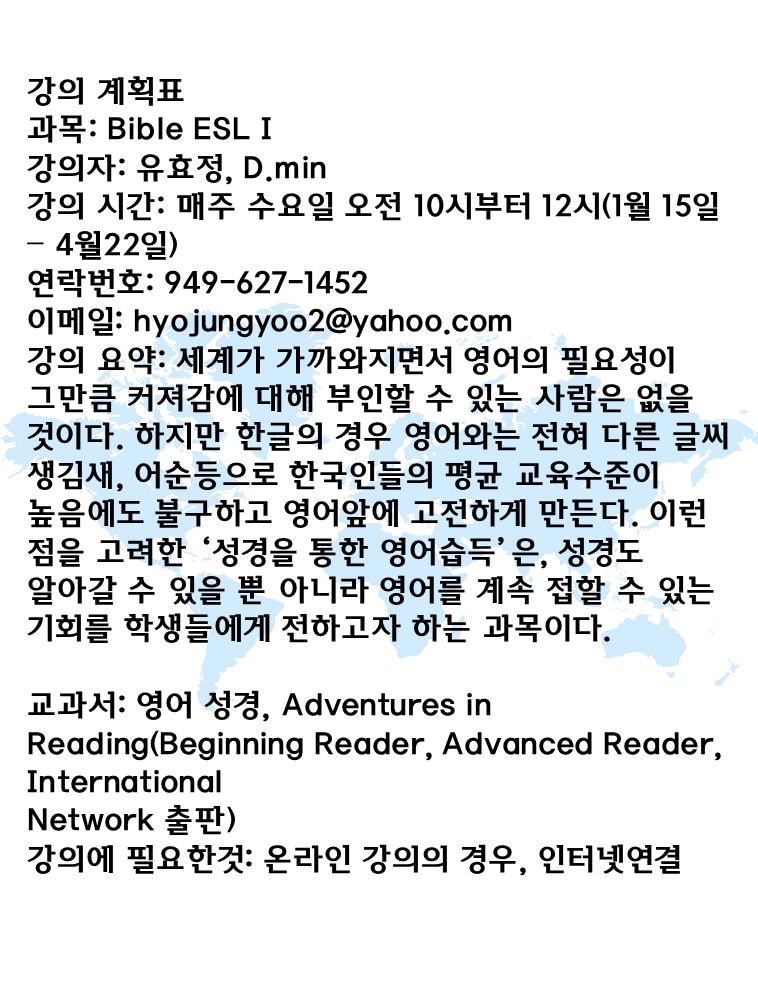 Home 선교정보 국가를 위한 기도 선교정보국가를 위한 기도 바이블 ESL(I) 강의 소개 (유효정박사. GMAN University) By Son4u - Jan 12, 2020 1017 0 SHARE Facebook Twitter