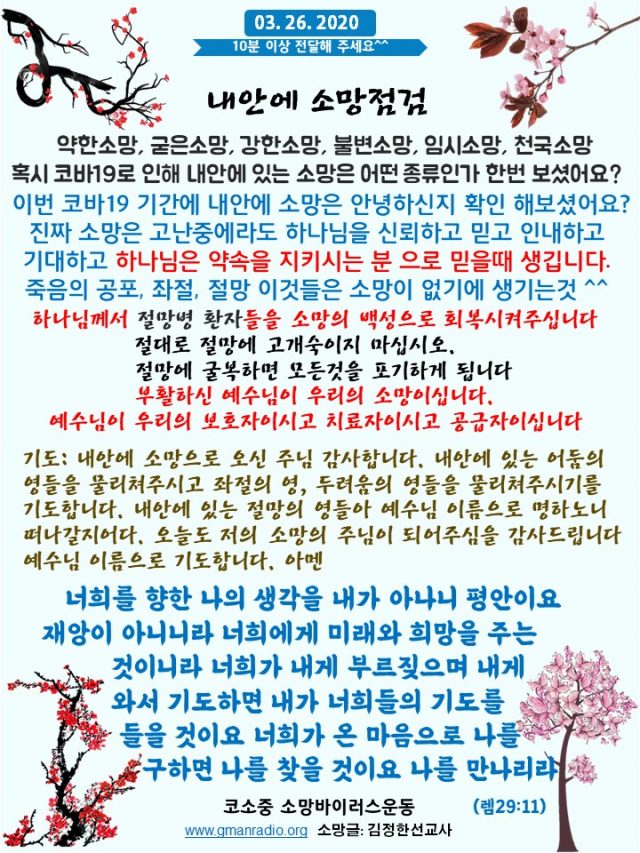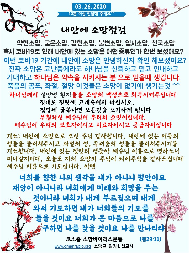 Home GMAN 라디오 GMAN 라디오GMAN 방송 포럼 소망바이러스 3/26/2020 “내안에 소망점검” By Son4u - Mar 26, 2020 2655 0 SHARE Facebook Twitter